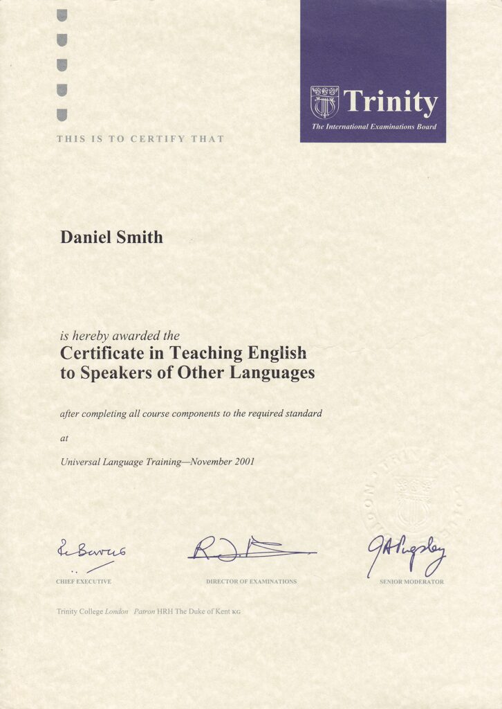 | 2001 | 英語が母国語ではない人に教える資格、ケーンブリジトリニティ大学のTESOL資格を得ました | |