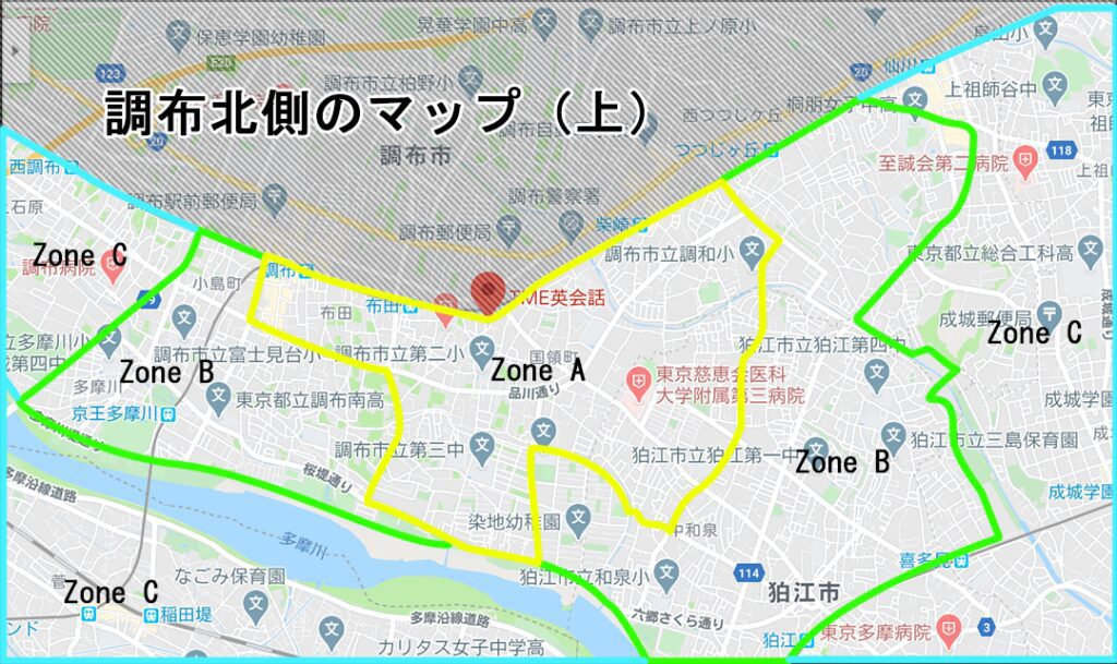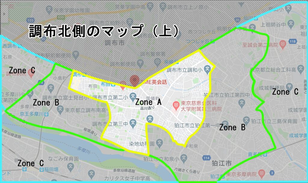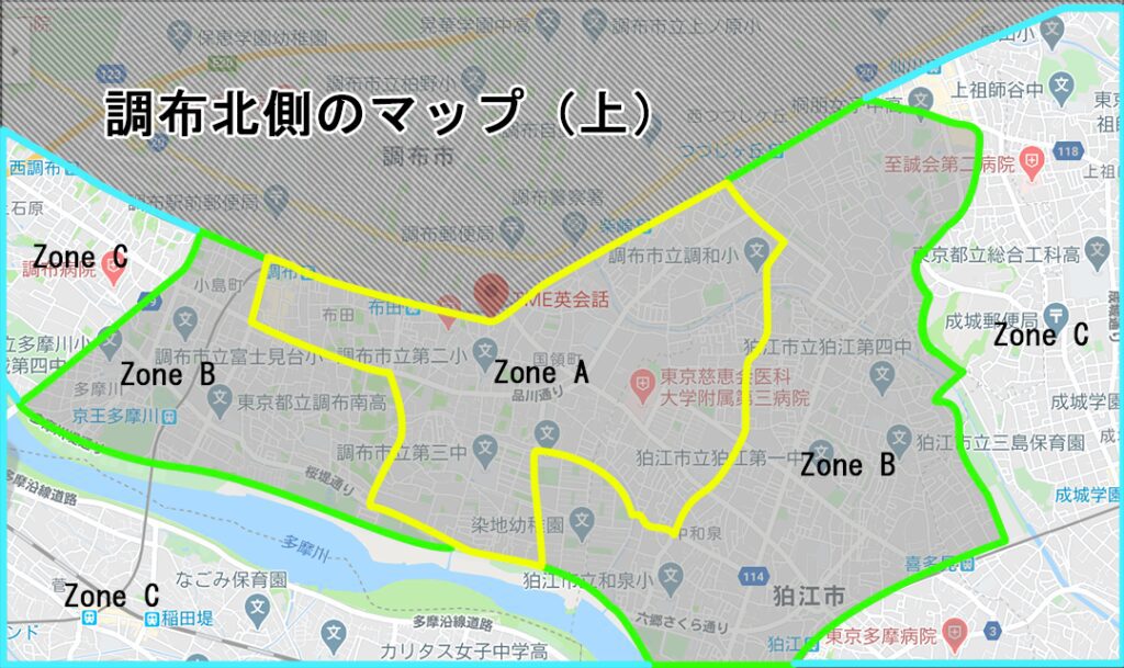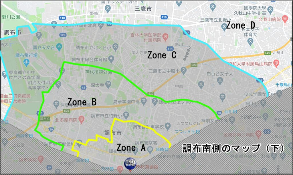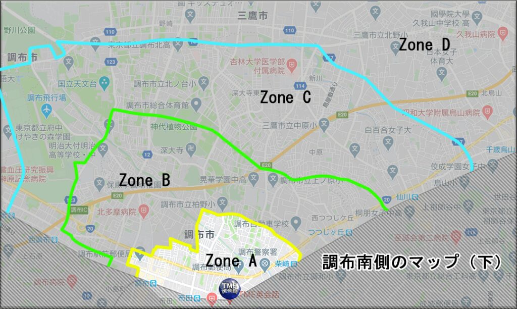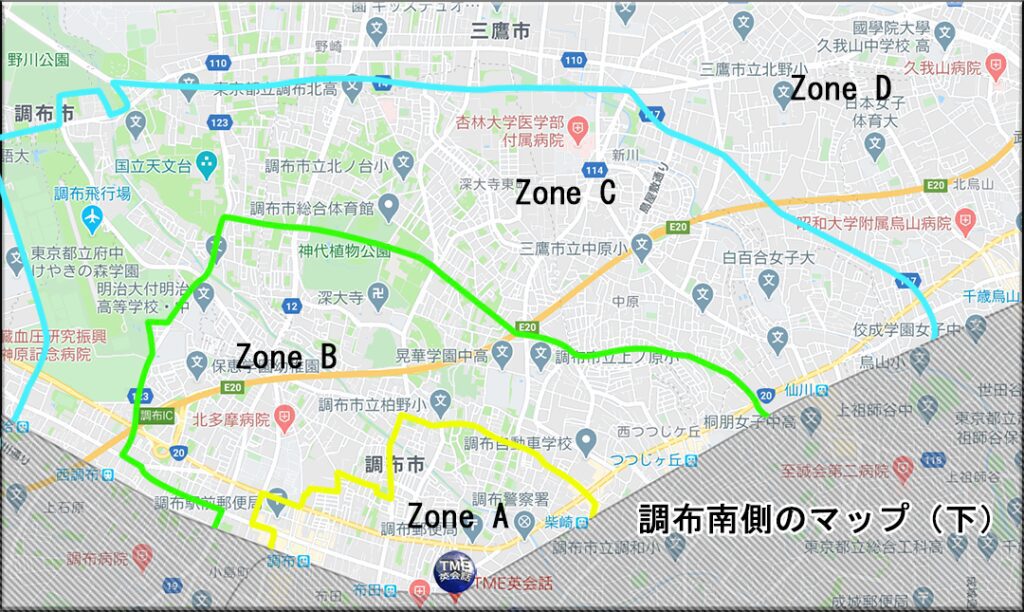 Zone B (東):染地(3町)、中和泉(全町)、元和泉(全町)、岩戸北(1,2町)、東野川(全町)、喜多見(9町)西野川(全町)、入間町(2町)若葉町(全町)、東つつじヶ丘(全町)、西つつじヶ丘(全町)